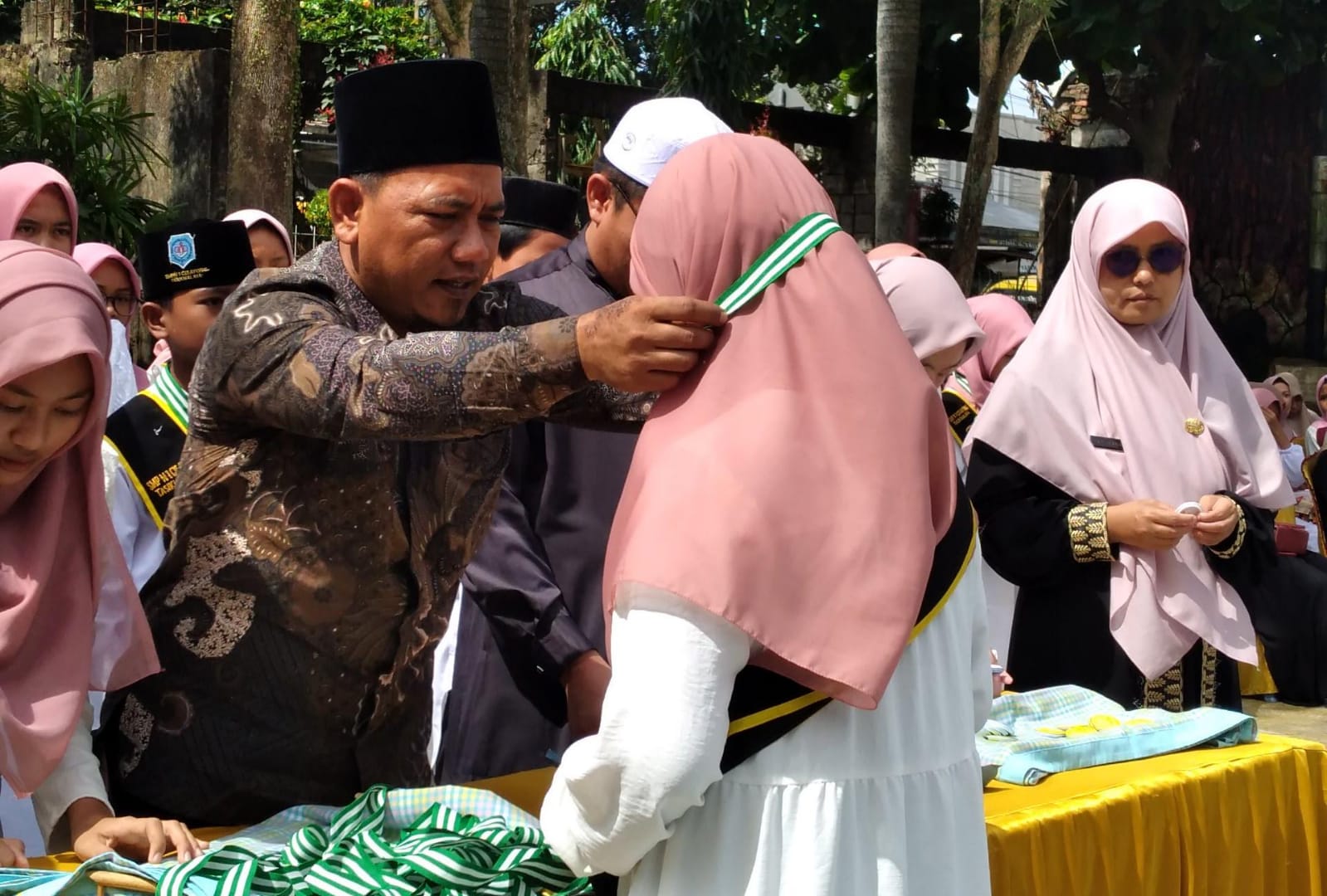 Perwakilan Yayasan Barakah, Muksin mengalungkan medali penghargaan Tahfidz dalam acara Wisuda Tahfidz di SMPN 1 Cisayong pada (5/2/2025).
